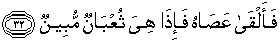 32. Maka Musa melemparkan tongkatnya, lalu tiba-tiba tongkat itu (menjadi) ular yang nyata.
