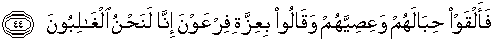 44. Lalu mereka melemparkan tali temali dan tongkat-tongkat mereka dan berkata: "Demi kekuasaan Fir'aun, sesungguhnya kami benar-benar akan menang."