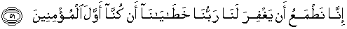 51. sesungguhnya kami amat menginginkan bahwa Tuhan kami akan mengampuni kesalahan kami, karena kami adalah orang-orang yang pertama-tama beriman."