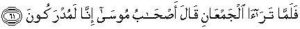 61. Maka setelah kedua golongan itu saling melihat, berkatalah pengikut-pengikut Musa: "Sesungguhnya kita benar-benar akan tersusul."