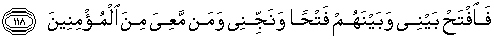 118. maka itu adakanlah suatu keputusan antaraku dan antara mereka, dan selamatkanlah aku dan orang-orang yang mukmin besertaku."