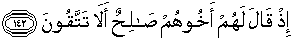 142. Ketika saudara mereka, Shaleh, berkata kepada mereka: "Mengapa kamu tidak bertakwa?