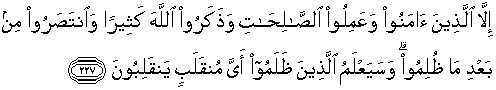 227. kecuali orang-orang (penyair-penyair) yang beriman dan beramal saleh dan banyak menyebut Allah dan mendapat kemenangan sesudah menderita kezaliman. Dan orang-orang yang zalim itu kelak akan mengetahui ke tempat mana mereka akan kembali.