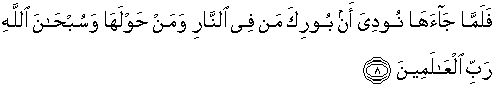 8. Maka tatkala dia tiba di (tempat) api itu, diserulah dia: "Bahwa telah diberkati orang-orang yang berada di dekat api itu, dan orang-orang yang berada di sekitarnya. Dan Maha Suci Allah, Tuhan semesta alam."