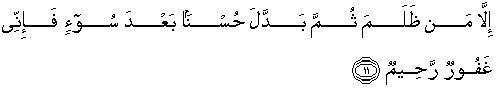 11. tetapi orang yang berlaku zalim, kemudian ditukarnya kezalimannya dengan kebaikan (Allah akan mengampuninya); maka seaungguhnya Aku Maha Pangampun lagi Maha Penyayang.