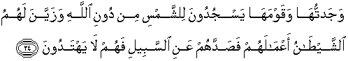 24. Aku mendapati dia dan kaumnya menyembah matahari, selain Allah; dan syaitan telah menjadikan mereka memandang indah perbuatan-perbuatan mereka lalu menghalangi mereka dari jalan (Allah), sehingga mereka tidak dapat petunjuk,