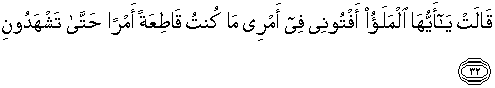 32. Berkata dia (Balqis): "Hai para pembesar berilah aku pertimbangan dalam urusanku (ini) aku tidak pernah memutuskan sesuatu persoalan sebelum kamu berada dalam majelis(ku)."