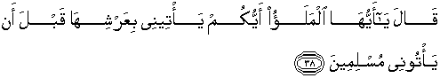 38. Berkata Sulaiman: "Hai pembesar-pembesar, siapakah di antara kamu sekalian yang sanggup membawa singgasananya kepadaku sebelum mereka datang kepadaku sebagai orang-orang yang berserah diri."