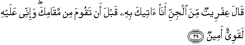 39. Berkata 'Ifrit (yang cerdik) dari golongan jin: "Aku akan datang kepadamu dengan membawa singgsana itu kepadamu sebelum kamu berdiri dari tempat dudukmu; sesungguhnya aku benar-benar kuat untuk membawanya lagi dapat dipercaya."