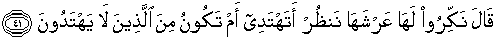 41. Dia berkata: "Robahlah baginya singgasananya; maka kita akan melihat apakah dia mengenal ataukah dia termasuk orang-orang yang tidak mengenal(nya)."