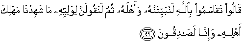 | 49.  Mereka berkata: "Bersumpahlah kamu dengan nama Allah, bahwa