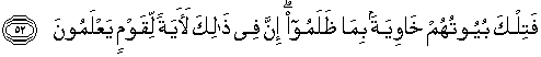 52. Maka itulah rumah-rumah mereka dalam keadaan runtuh disebabkan kezaliman mereka. Sesungguhnya pada yang demikian itu (terdapat) pelajaran bagi kaum yang mengetahui.