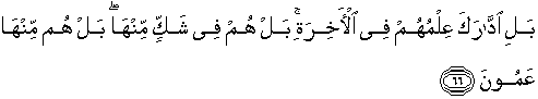 66. Sebenarnya pengetahuan mereka tentang akhirat tidak sampai (kesana) malahan mereka ragu-ragu tentang akhirat itu, lebih-lebih lagi mereka buta daripadanya.