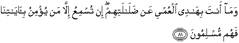 81. Dan kamu sekali-kali tidak dapat memimpin (memalingkan) orang-orang buta dari kesesatan mereka. Kamu tidak dapat menjadikan (seorangpun) mendengar, kecuali orang-orang yang beriman kepada ayat-ayat Kami, lalu mereka berserah diri.