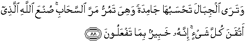 88. Dan kamu lihat gunung-gunung itu, kamu sangka dia tetap di tempatnya, padahal ia berjalan sebagai jalannya awan. (Begitulah) perbuatan Allah yang membuat dengan kokoh tiap-tiap sesuatu; sesungguhnya Allah Maha Mengetahui apa yang kamu kerjakan.