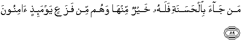 89. Barangsiapa yang membawa kebaikan, maka ia memperoleh (balasan) yang lebih baik dari padanya, sedang mereka itu adalah orang-orang yang aman tenteram dari pada kejutan yang dahsyat pada hari itu.