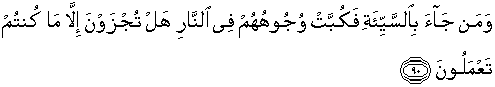 90. Dan barang siapa yang membawa kejahatan, maka disungkurkanlah muka mereka ke dalam neraka. Tiadalah kamu dibalasi, melainkan (setimpal) dengan apa yang dahulu kamu kerjakan.