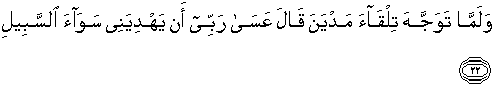 22. Dan tatkala ia menghadap kejurusan negeri Mad-yan ia berdoa (lagi): "Mudah-mudahan Tuhanku memimpinku ke jalan yang benar."