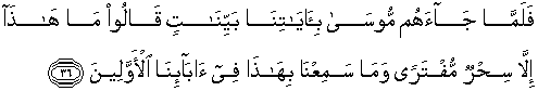 36. Maka tatkala Musa datang kepada mereka dengan (membawa) mukjizat- mukjizat Kami yang nyata, mereka berkata: "Ini tidak lain hanyalah sihir yang dibuat-buat dan kami belum pernah mendengar (seruan yang seperti) ini pada nenek moyang kami dahulu."