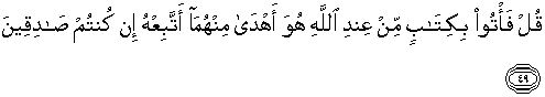 49. Katakanlah: "Datangkanlah olehmu sebuah kitab dari sisi Allah yang kitab itu lebih (dapat) memberi petunjuk daripada keduanya (Taurat dan Al Quran) niscaya aku mengikutinya, jika kamu sungguh orang-orang yang benar."