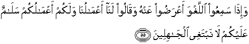 55. Dan apabila mereka mendengar perkataan yang tidak bermanfaat, mereka berpaling daripadanya dan mereka berkata: "Bagi kami amal-amal kami dan bagimu amal-amalmu, kesejahteraan atas dirimu, kami tidak ingin bergaul dengan orang-orang jahil."