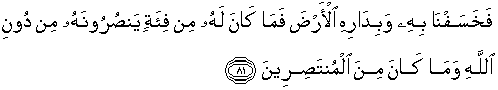 81. Maka Kami benamkanlah Karun beserta rumahnya ke dalam bumi. Maka tidak ada baginya suatu golonganpun yang menolongnya terhadap azab Allah. Dan tiadalah ia termasuk orang-orang (yang dapat) membela (dirinya).