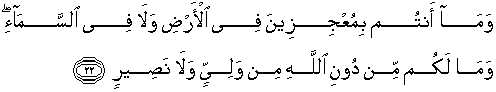 22. Dan kamu sekali-kali tidak dapat melepaskan diri (dari azab Allah) di bumi dan tidak (pula) di langit dan sekali-kali tiadalah bagimu pelindung dan penolong selain Allah.