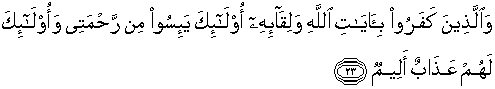 23. Dan orang-orang yang kafir terhadap ayat-ayat Allah dan pertemuan dengan Dia, mereka putus asa dari rahmat-Ku, dan mereka itu mendapat azab yang pedih.