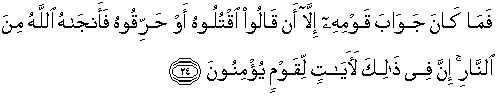 24. Maka tidak adalah jawaban kaum Ibrahim, selain mengatakan: "Bunuhlah atau bakarlah dia", lalu Allah menyelamatkannya dari api. Sesungguhnya pada yang demikian itu benar-benar terdapat tanda-tanda kebesaran Allah bagi orang-orang yang beriman.