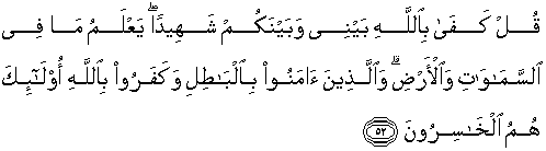 52. Katakanlah: "Cukuplah Allah menjadi saksi antaraku dan antaramu. Dia mengetahui apa yang di langit dan di bumi. Dan orang-orang yang percaya kepada yang batil dan ingkar kepada Allah, mereka itulah orang-orang yang merugi.