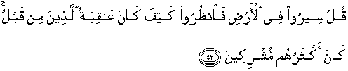 42. Katakanlah: "Adakanlah perjalanan di muka bumi dan perhatikanlah bagaimana kesudahan orang-orang yang terdahulu. Kebanyakan dari mereka itu adalah orang-orang yang mempersekutukan (Allah)."