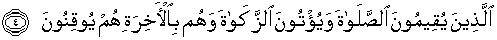 4. (yaitu) orang-orang yang mendirikan shalat, menunaikan zakat dan mereka yakin akan adanya negeri akhirat.