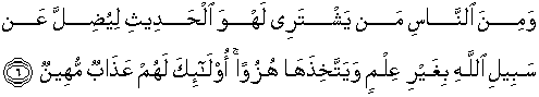6. Dan di antara manusia (ada) orang yang mempergunakan perkataan yang tidak berguna untuk menyesatkan (manusia) dari jalan Allah tanpa pengetahuan dan menjadikan jalan Allah itu olok-olokan. Mereka itu akan memperoleh azab yang menghinakan.