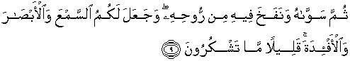 9. Kemudian Dia menyempurnakan dan meniupkan ke dalamnya roh (ciptaan)-Nya dan Dia menjadikan bagi kamu pendengaran, penglihatan dan hati; (tetapi) kamu sedikit sekali bersyukur.
