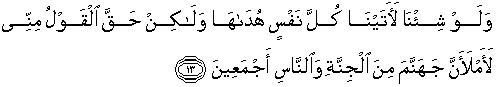 13. Dan kalau Kami menghendaki niscaya Kami akan berikan kepada tiap- tiap jiwa petunjuk, akan tetapi telah tetaplah perkataan dari padaKu: "Sesungguhnya akan Aku penuhi neraka jahannam itu dengan jin dan manusia bersama-sama."