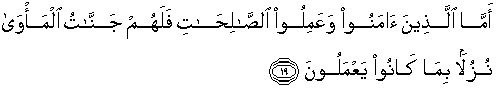 19. Adapun orang-orang yang beriman dan mengerjakan amal saleh, maka bagi mereka jannah tempat kediaman, sebagai pahala terhadap apa yang mereka kerjakan.