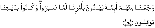 24. Dan Kami jadikan di antara mereka itu pemimpin-pemimpin yang memberi petunjuk dengan perintah Kami ketika mereka sabar