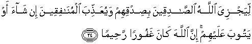 24. supaya Allah memberikan balasan kepada orang-orang yang benar itu karena kebenarannya, dan menyiksa orang munafik jika dikehendaki-Nya, atau menerima taubat mereka. Sesungguhnya Allah adalah Maha Pengampun lagi Maha Penyayang.