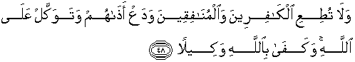 48. Dan janganlah kamu menuruti orang-orang yang kafir dan orang- orang munafik itu, janganlah kamu hiraukan gangguan mereka dan bertawakkallah kepada Allah. Dan cukuplah Allah sebagai Pelindung.