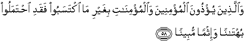 58. Dan orang-orang yang menyakiti orang-orang yang mukmin dan mukminat tanpa kesalahan yang mereka perbuat, maka sesungguhnya mereka telah memikul kebohongan dan dosa yang nyata.
