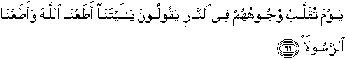 66. Pada hari ketika muka mereka dibolak-balikan dalam neraka, mereka berkata: "Alangkah baiknya, andaikata kami taat kepada Allah dan taat (pula) kepada Rasul."
