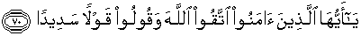 70. Hai orang-orang yang beriman, bertakwalah kamu kepada Allah dan katakanlah perkataan yang benar,