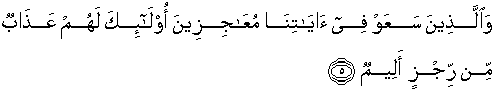 5. Dan orang-orang yang berusaha untuk (menentang) ayat-ayat Kami dengan anggapan mereka dapat melemahkan (menggagalkan azab Kami), mereka itu memperoleh azab, yaitu (jenis) azab yang pedih.