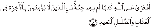 8. Apakah dia mengada-adakan kebohongan terhadap Allah ataukah ada padanya penyakit gila?" (Tidak), tetapi orang-orang yang tidak beriman kepada negeri akhirat berada dalam siksaan dan kesesatan yang jauh.