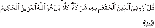 27. Katakanlah: "Perlihatkanlah kepadaku sembah-sembahan yang kamu hubungkan dengan Dia sebagai sekutu-sekutu-Nya, sekali-kali tidak mungkin! Sebenarnya Dia-lah Allah Yang Maha Perkasa lagi Maha Bijaksana.