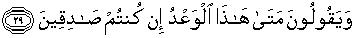 29. Dan mereka berkata: "Kapankah (datangnya) janji ini, jika kamu adalah orang-orang yang benar?."