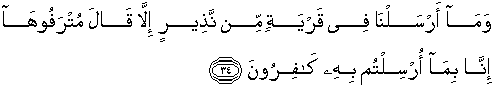 34. Dan Kami tidak mengutus kepada suatu negeri seorang pemberi peringatanpun, melainkan orang-orang yang hidup mewah di negeri itu berkata: "Sesungguhnya kami mengingkari apa yang kamu diutus untuk menyampaikannya."