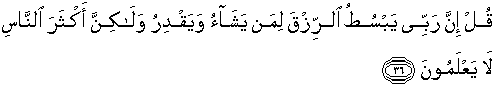 36. Katakanlah: "Sesungguhnya Tuhanku melapangkan rezki bagi siapa yang dikehendaki-Nya dan menyempitkan (bagi siapa yang dikehendaki-Nya). akan tetapi kebanyakan manusia tidak mengetahui."