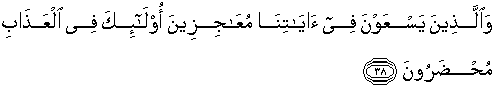 38. Dan orang-orang yang berusaha (menentang) ayat-ayat Kami dengan anggapan untuk dapat melemahkan (menggagalkan azab Kami), mereka itu dimasukkan ke dalam azab.
