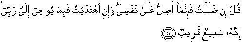 50. Katakanlah: "Jika aku sesat maka sesungguhnya aku sesat atas kemudharatan diriku sendiri; dan jika aku mendapat petunjuk maka itu adalah disebabkan apa yang diwahyukan Tuhanku kepadaku. Sesungguhnya Dia Maha Mendengar lagi Maha Dekat."
